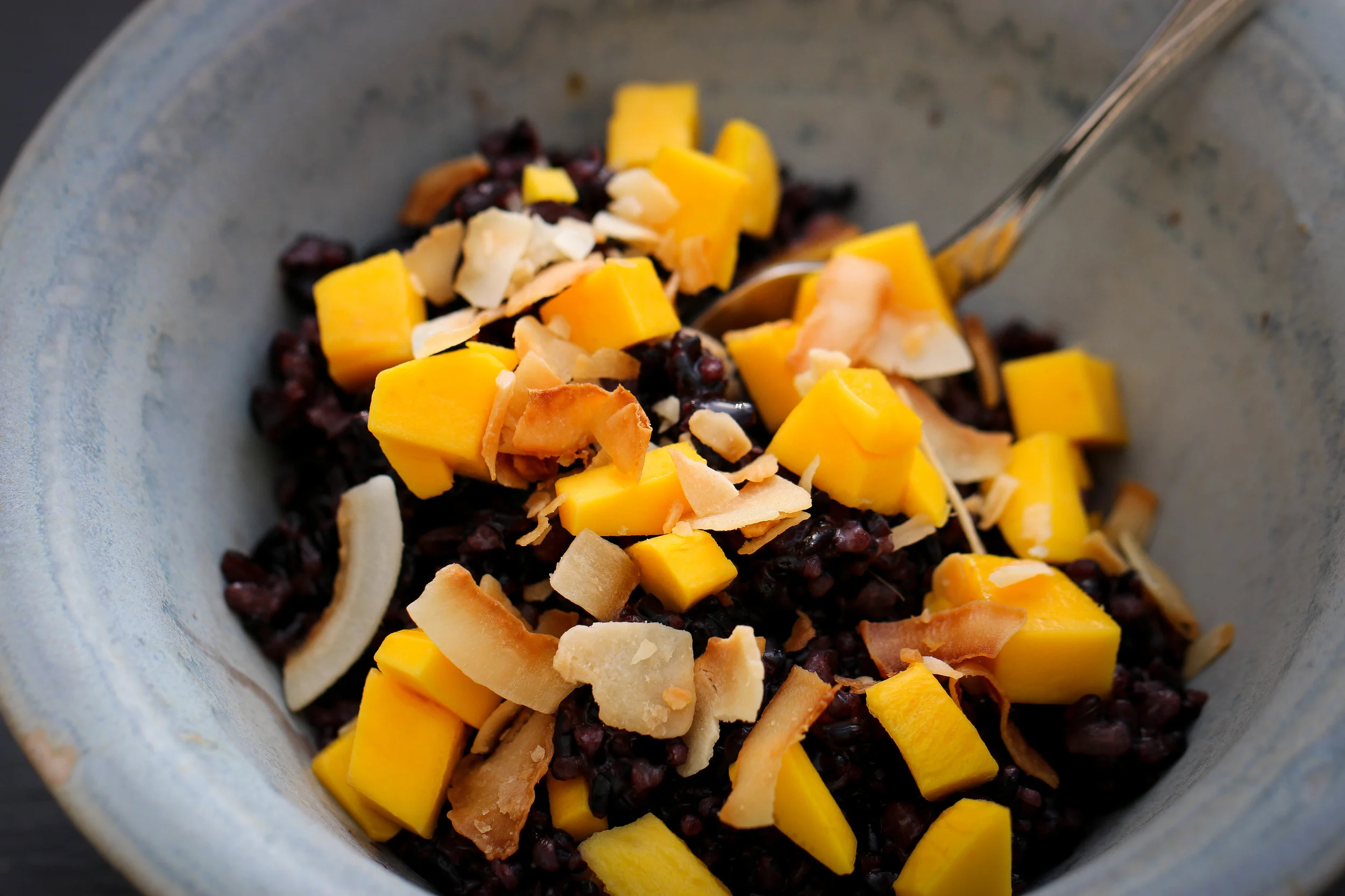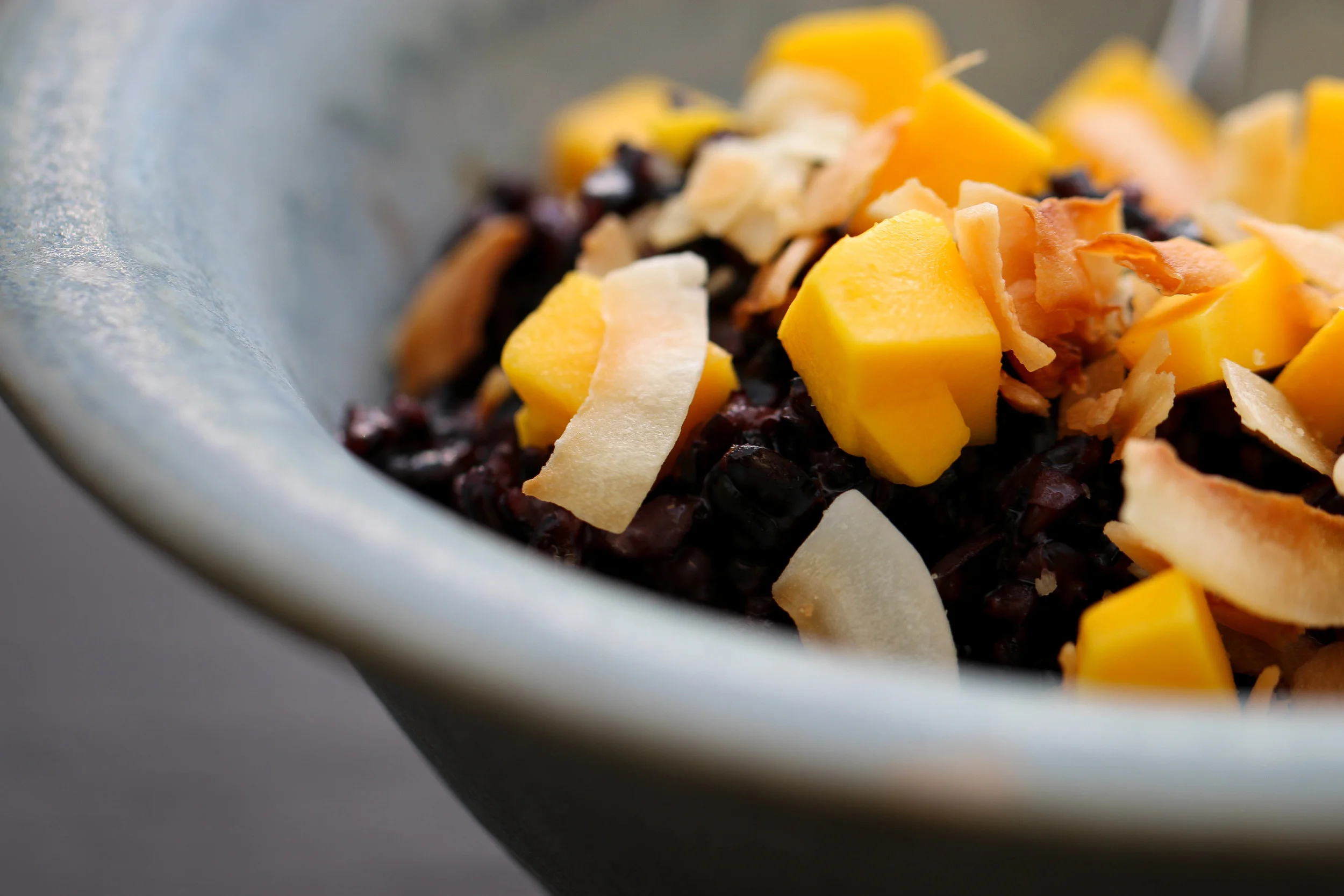 Black Rice Pudding with Coconut & Lemongrass grew out of our friend Marcia's request for a creative way to highlight the unique flavor and earthy purple hue of black forbidden rice. During my time in Cambodia as a college student, I lived with an outstanding cook who taught me to coax flavor from a limited set of ingredients, often only herbs and rice. This dessert marries the nutty sweetness of black forbidden rice with lemongrass's distinctive bright and herby citrus flavor. Using only coconut milk and egg yolks in the subtly sweet sauce allows the dish to be gluten free and dairy free, two special requests of our friend Marcia. In this case, keeping dairy and thickeners out of the picture allows for a purer flavor and lighter texture. We used fresh mango and toasted coconut as a garnish to contrast with the creamy purple pudding.