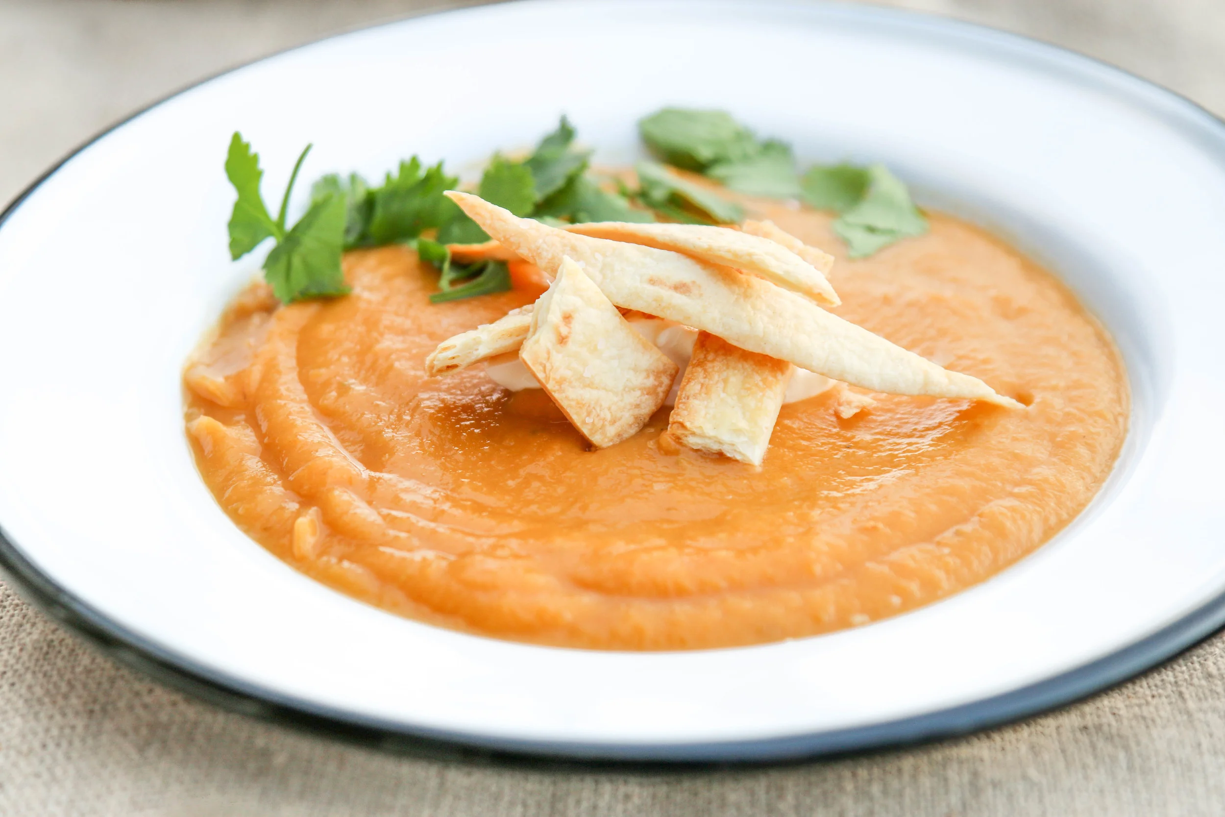 - Serve the soup hot, with scoops of sour cream, chopped cilantro or chimichurri sauce and a squeeze of lime in each bowl. Top with the baked tortilla strips.